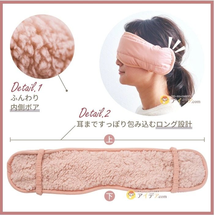 ふんわりとしたボア素材が目元と耳まで優しく包み込むホットタイプのアイマスクです。